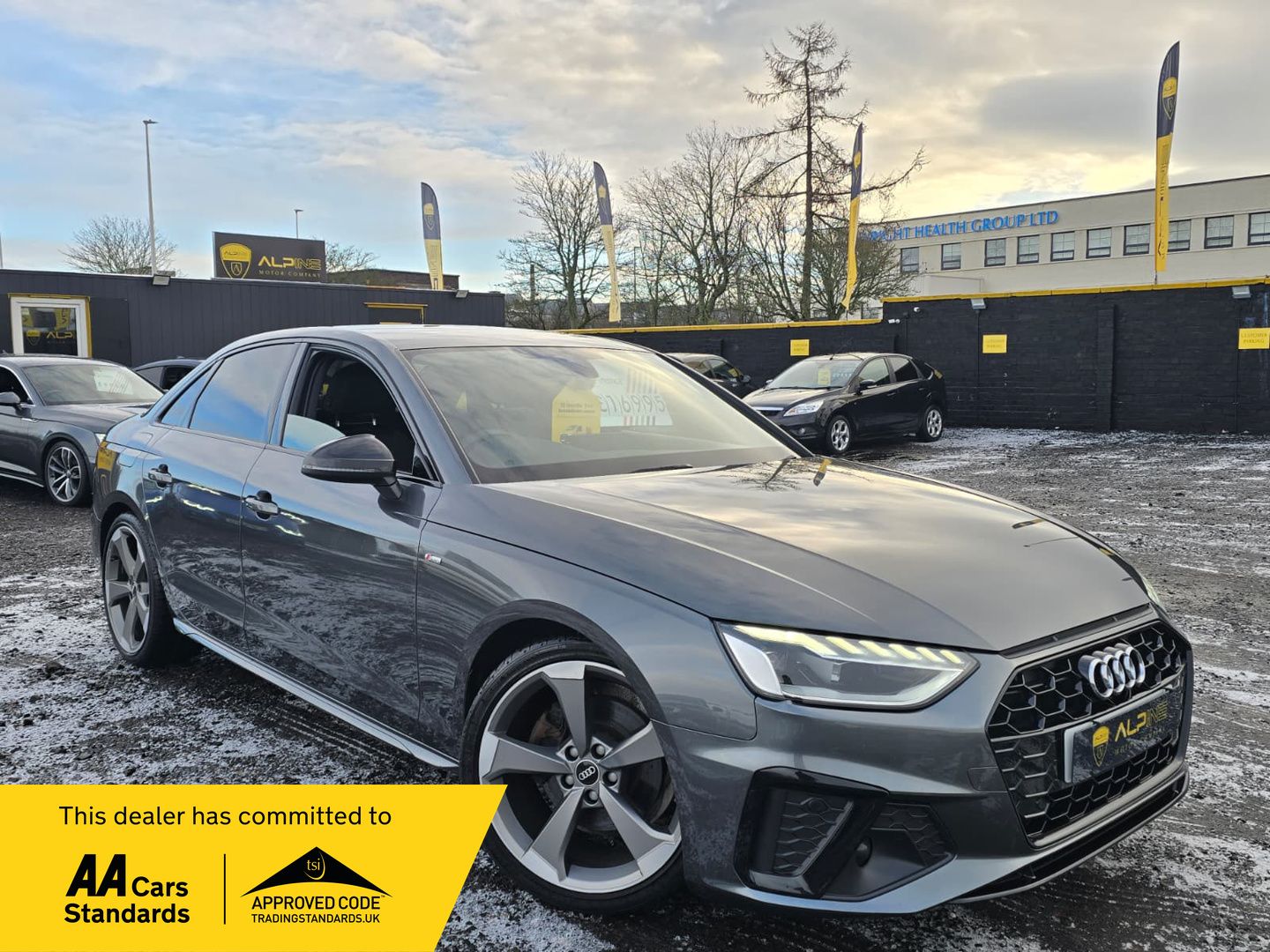 Experience the perfect blend of luxury and performance with the Audi A4 2.0 TFSI 35 Black Edition Saloon, now available at Alpine Motor Company in Dundee. Dressed in a sophisticated Daytona Grey Pearl Effect, this striking vehicle stands out with its sleek lines and dynamic styling. With just one previous owner and a full-service history, you can trust in the exceptional quality and care that has gone into maintaining this car. Powered by a 150 ps petrol engine and equipped with a smooth S Tronic transmission, this A4 delivers an exhilarating driving experience. The 2.0 TFSI engine not only offers remarkable performance but also meets Euro 6 emissions standards, ensuring compliance with ULEZ regulations. Step inside to discover the state-of-the-art Virtual Cockpit, which transforms your driving experience with a fully customisable digital dashboard. The sport-inspired flat bottom steering wheel adds a touch of elegance and enhanced ergonomics, making every journey a pleasure. Don’t miss this opportunity to own a blend of cutting-edge technology and refined style. Visit Alpine Motor Company today to test drive the Audi A4 2.0 TFSI 35 Black Edition Saloon and elevate your driving experience!